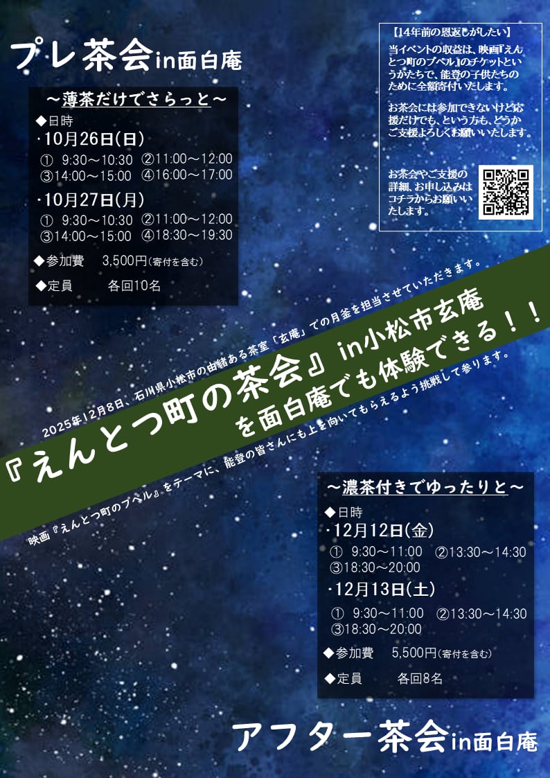 小松でのお茶会を面白庵でも開催しその収益を全額そのチケット購入に充ててプレゼントしたいと思います。